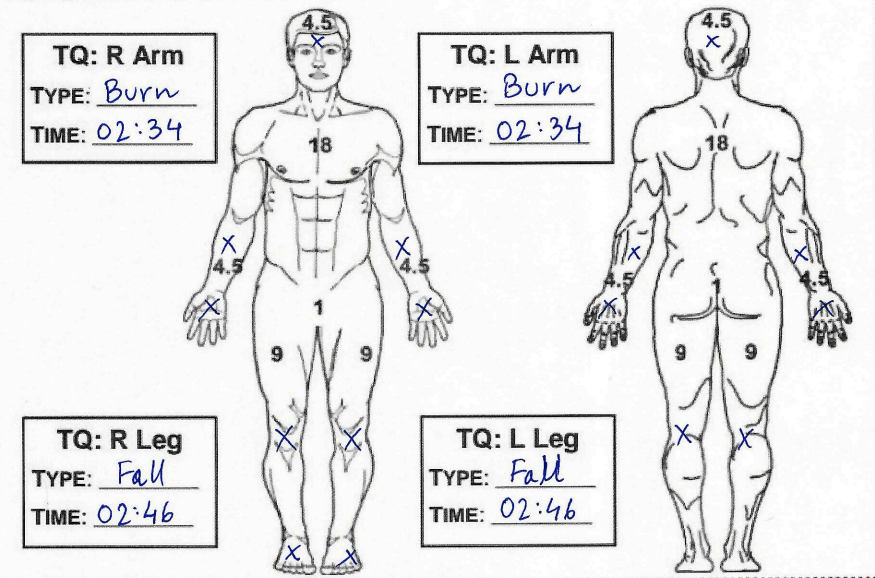 NAME (Last, First): Scanner, Hand LAST 4: 0007 DATE (DD-MMM-YY): 01-JAN-24 TIME: 03:00 UNIT: #5678 ALLERGIES: -NA- Mechanism of Injury: (X all that apply) [ ] Artillery [x] Burn [x] Fall [ ] Grenade [ ] GSW [ ] IED [ ] Landmine [ ] MVC [ ] RPG [x] Other: Sad
